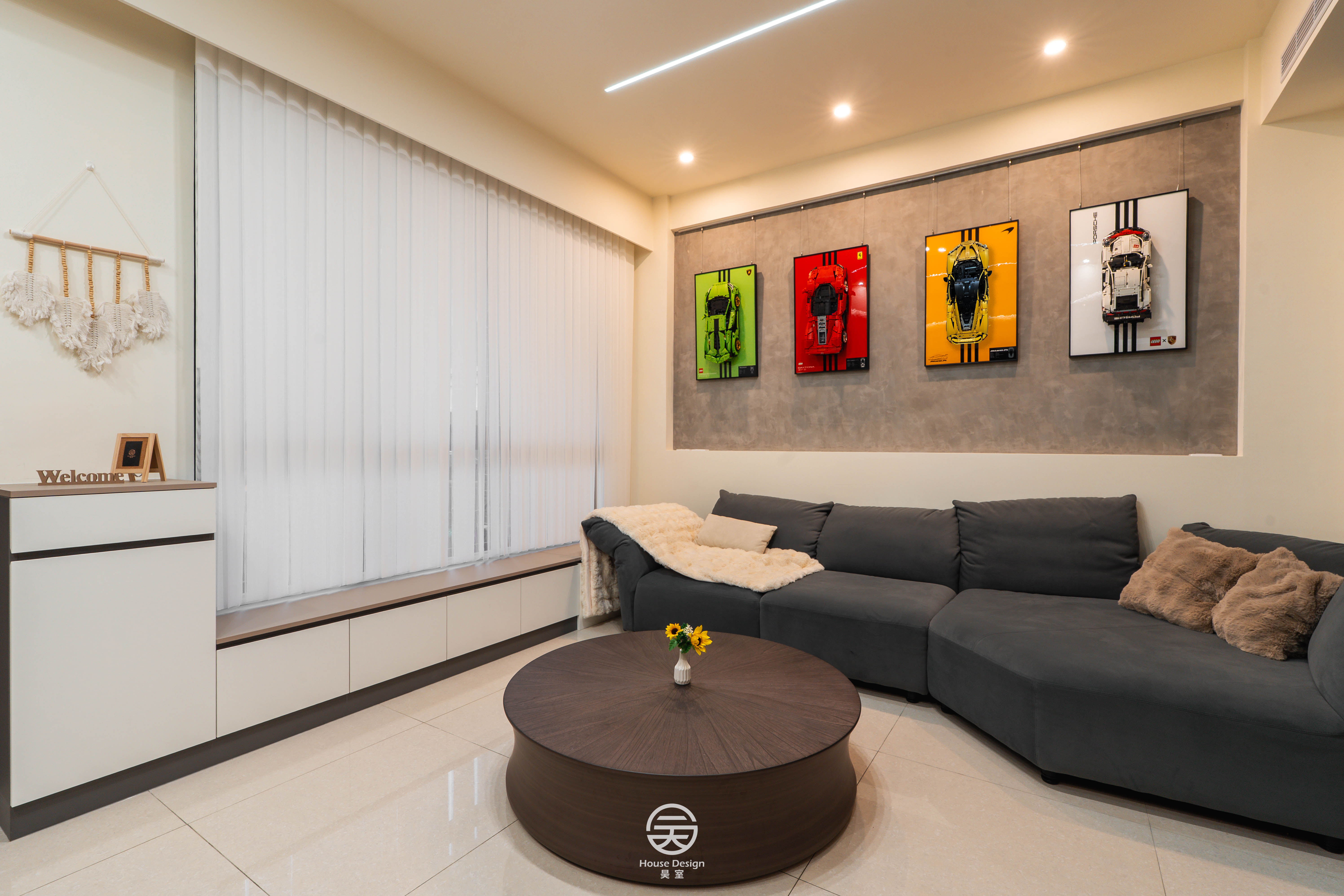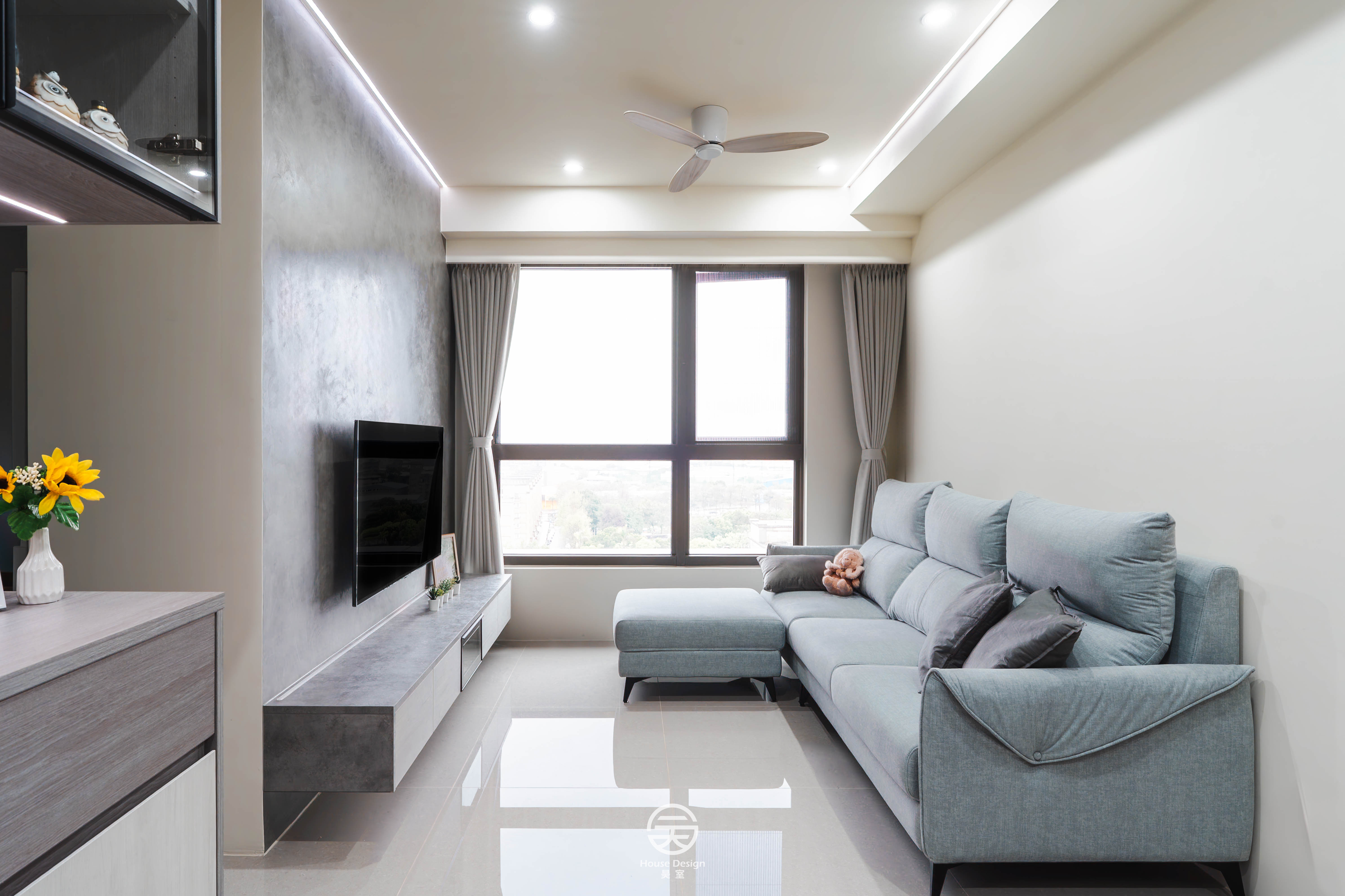 灰壁映黑檯,氣韻沉靜,簡潔無華,旁置書卷與花卉,清雅自成,誠現代居所之靜謐雅境也。